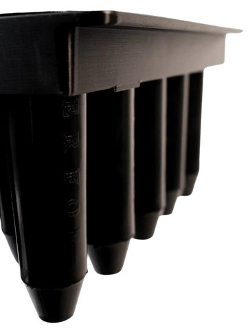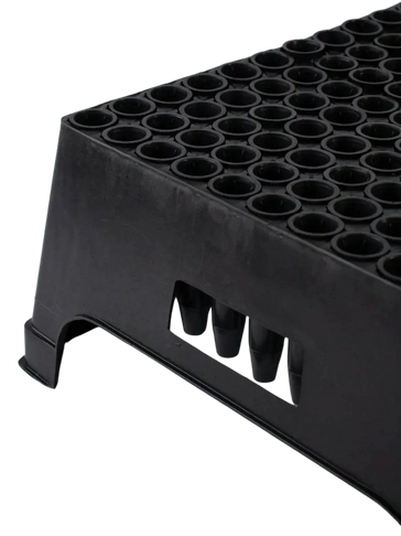 Las bandejas complementan el uso de tubetes al permitir un manejo eficiente y un mejor aprovechamiento del espacio en los viveros. Pueden ser planas o con patas, y están diseñadas para sostener múltiples tubetes, facilitando su transporte y almacenamiento.